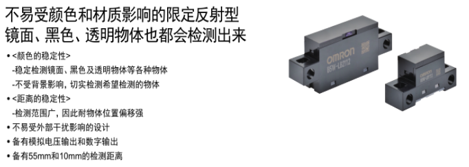 歐姆龍傳感器抗陽光干擾強,可穩定檢測鏡面、黑色、透明物體,推出限定反射型傳感器B5W系列。接受來自檢測物體的反射光以檢測物體有無,擁有限定了投光光束和受光區域的光學系統,僅可檢測相距傳感器一定距離(投光光束與受光區域重合的范圍)的檢測物體。